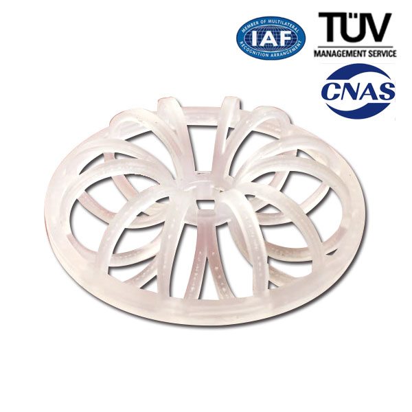 Material: PE, PP, RPP, PVC, CPVC and PVDF. Tellerette Packing Rings have features such as high void ratio, low pressure drop, low mass-transfer unit height, high flooding point, uniform gas-liquid contact, small specific weight, high mass transfer efficiency, etc., and the application temperature in media ranges from 60℃ to 150 ℃.For these reasons, them are widely used in the packing towers in petroleum industry, chemical industry, alkali-Chloride industry, coal gas industry and environmental protection, etc.